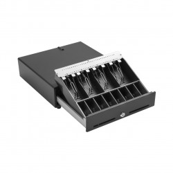 Cajón portamonedas automático Concord, Apertura Vertical, Medidas 460x170x100mm, 6 compartimentos para billetes, 8 compartimentos para monedas, 1 compartimento para cheques, Gaveta con tapa y llave, Conexión a la impresora de caja, RJ11, 24V, color negro
